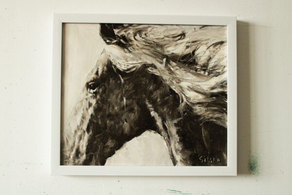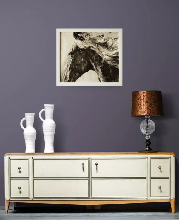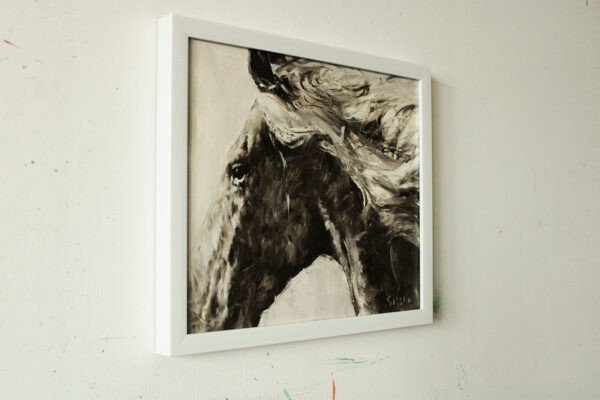 horse’s form and expression. The artist’s signature is subtly placed, blending