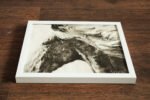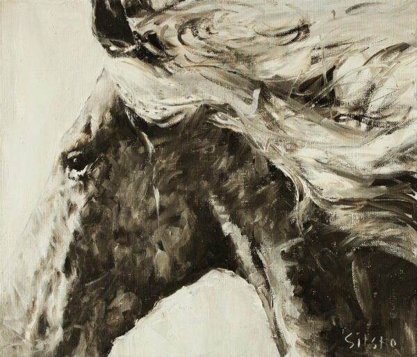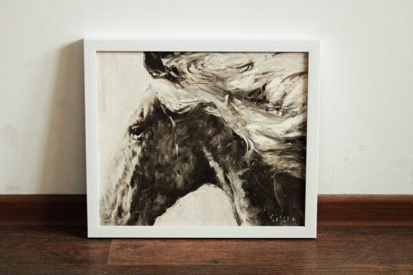 white, and shades of gray to emphasize the horse’s powerful presence and gentle