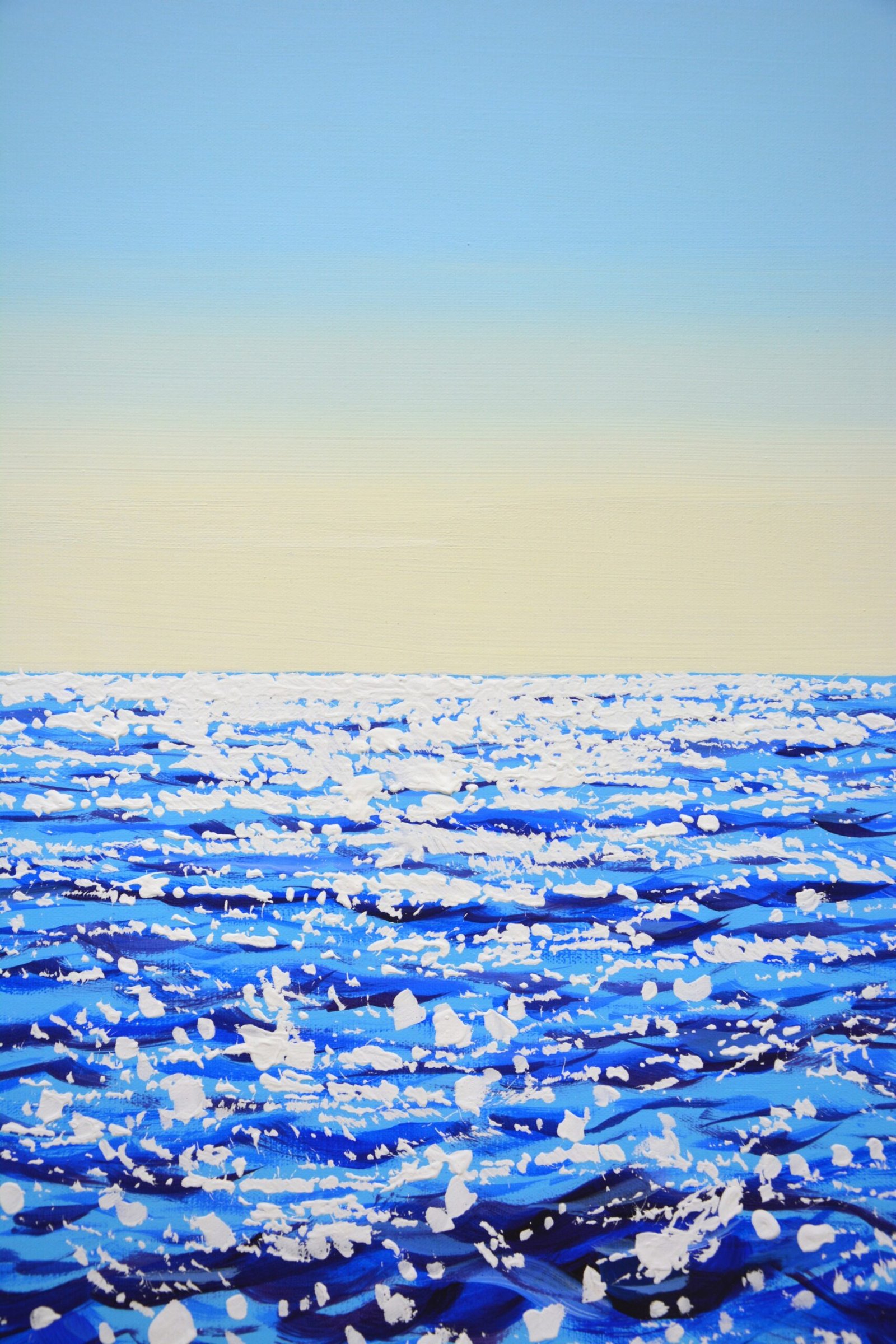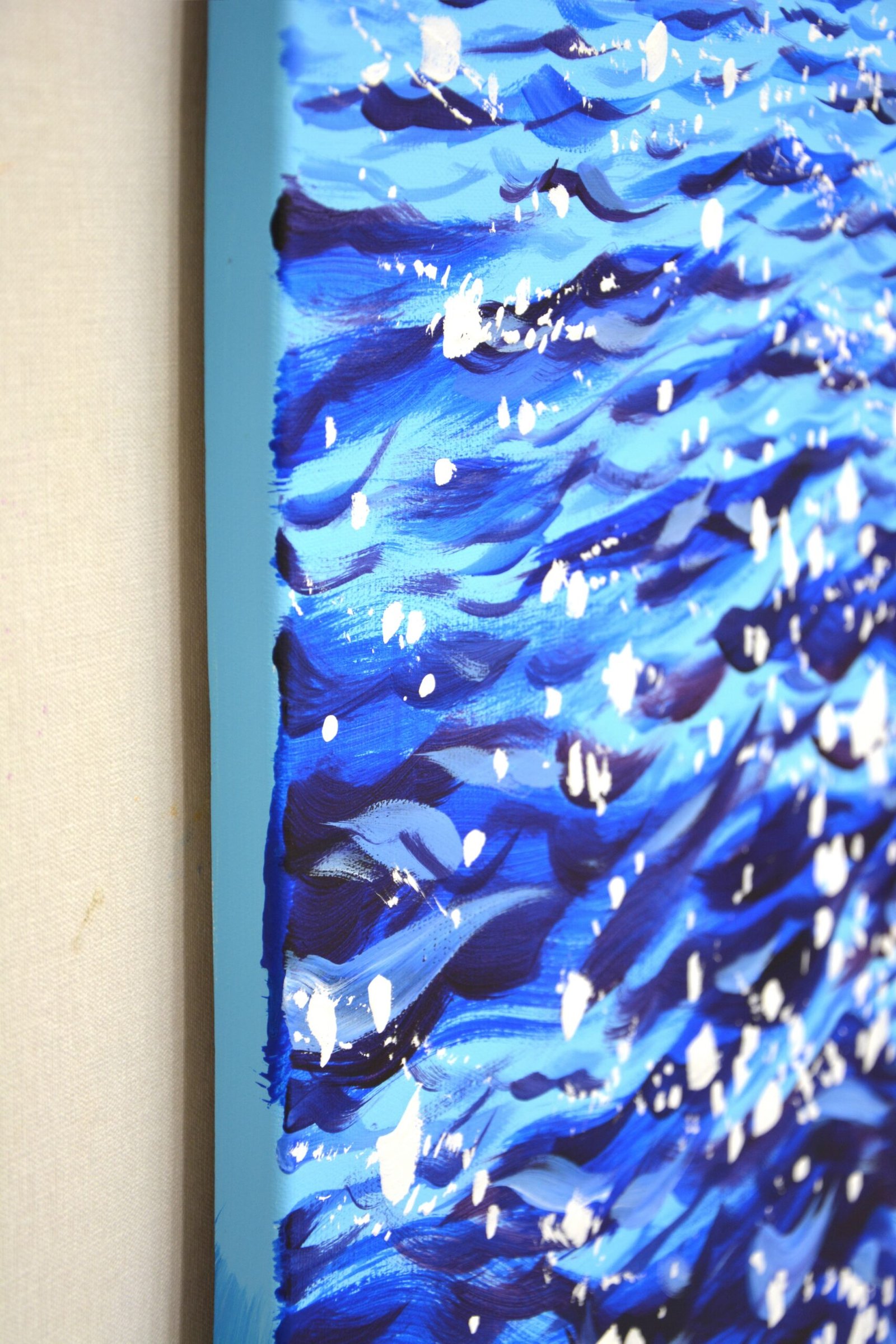 In this painting, I’ve captured the vibrant essence and rhythmic undulation of the sea. Using acrylics, I layered blues and whites to emulate the sparkling sunlight dancing on water. This piece evokes a sense of calm yet profound energy, reflecting the depth and serenity of the ocean. It’s designed to bring a sense of peace and expansive wonder into any space, transforming your home with the tranquil yet dynamic spirit of the sea. Used high quality materials. Acrylic painting on canvas. Covered with varnish. The artist’s signature, the sides are painted in the color of the painting. Ready to hang. Certificate of Authenticity.