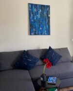 “Introducing ‘Brooklyn’ by the renowned artist Helen She. This striking piece is part of the artist’s city and country collection and is one of the first paintings of New York City. This abstract work of art, sold in Manhattan, is a creative representation of the artist’s vision of Brooklyn. As the artist has not visited the city, the painting is a fantastical interpretation of the artist’s imagination. The colors are dominated by shades of blue, which evoke the presence of water and the Brooklyn Bridge. The abstract style adds a dynamic sense of movement and energy, making it an engaging and thought-provoking piece. It’s a must-have for any art lover, particularly those with a connection to New York City.”