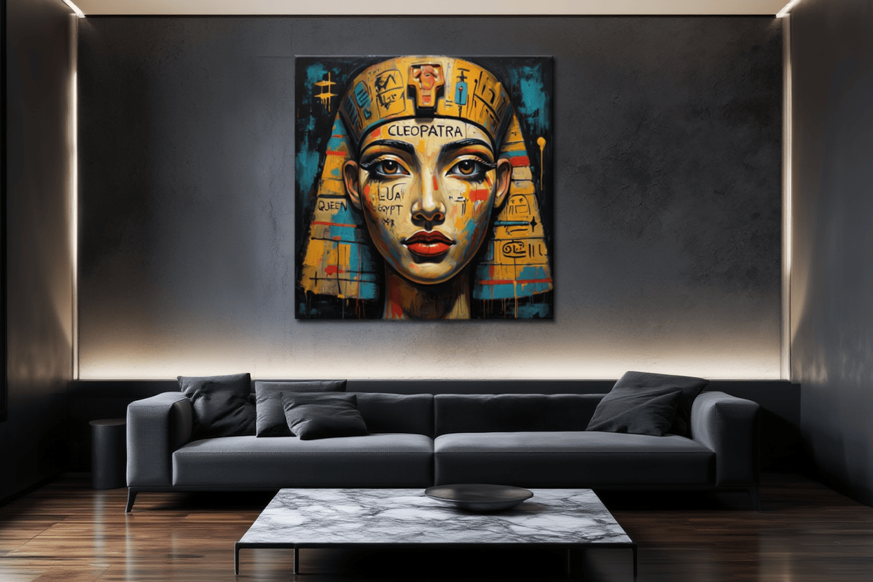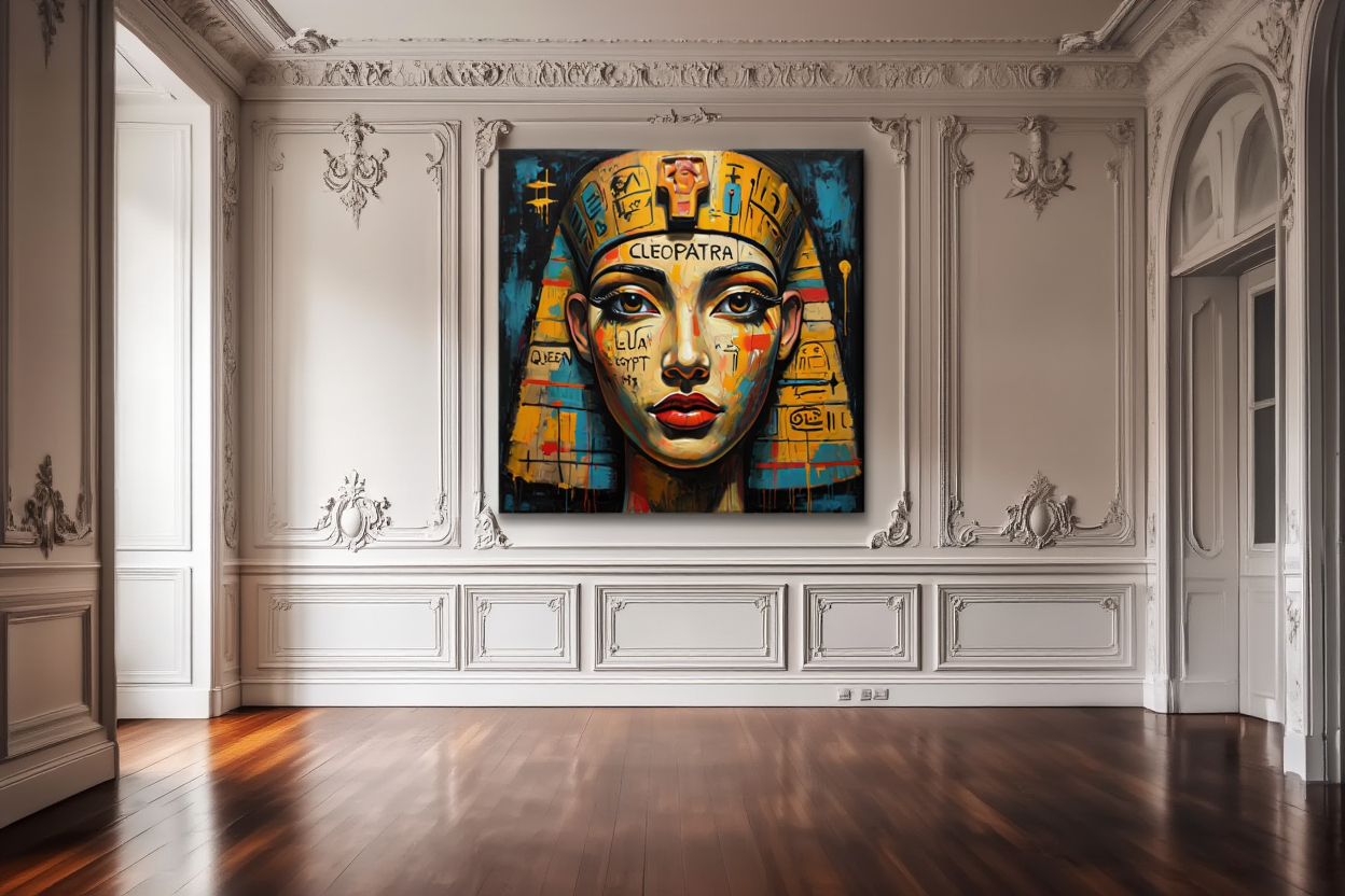 The portrait dances between mythology and modernity — portraying Cleopatra not as a distant historical figure, but as an eternal icon of influence and resilience.