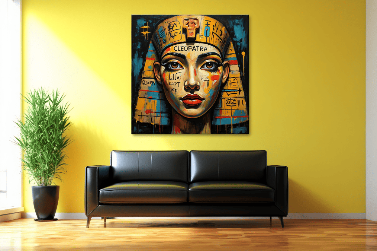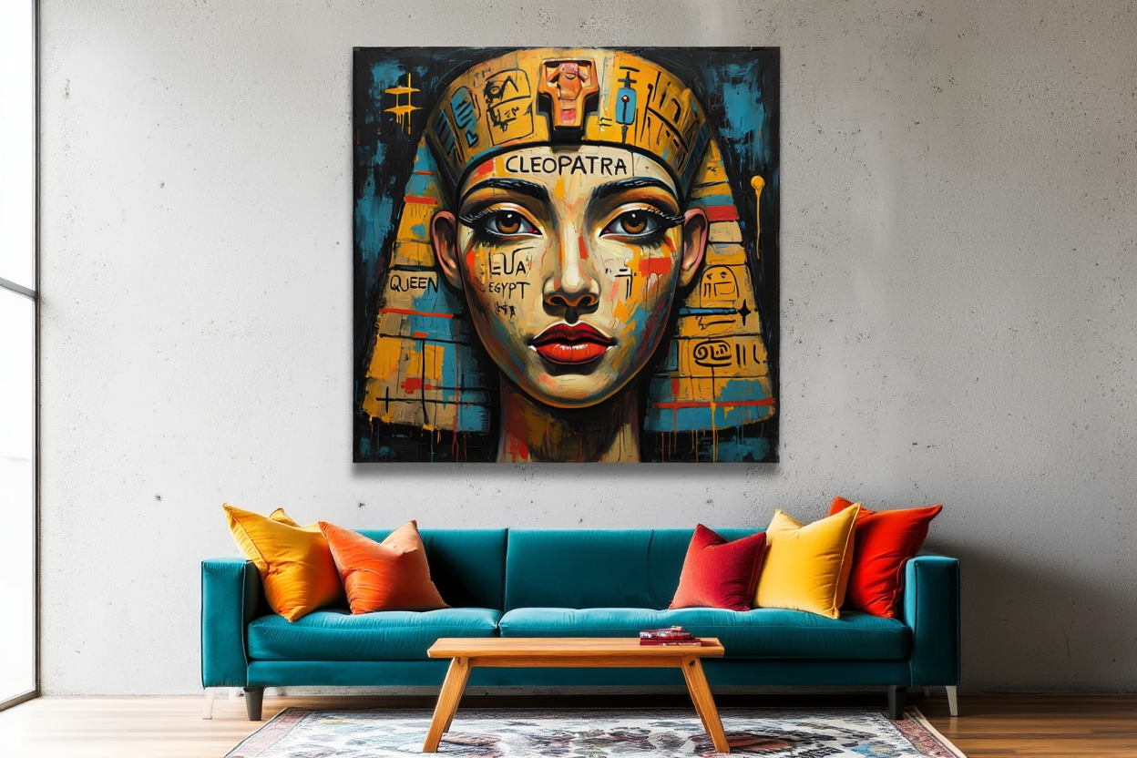 “Crown of the Nile” reimagines Cleopatra — the legendary queen and symbol of beauty, intellect, and power — through the lens of neo-expressionist pop-art energy.