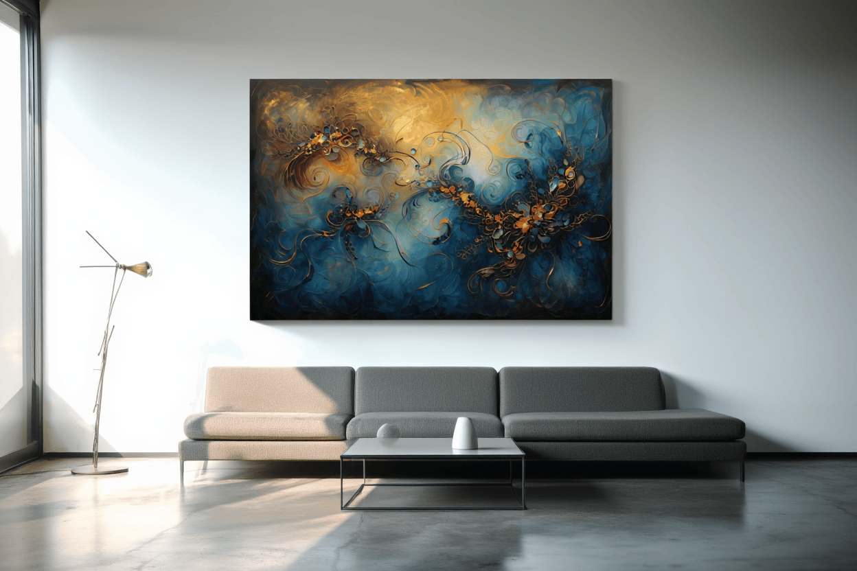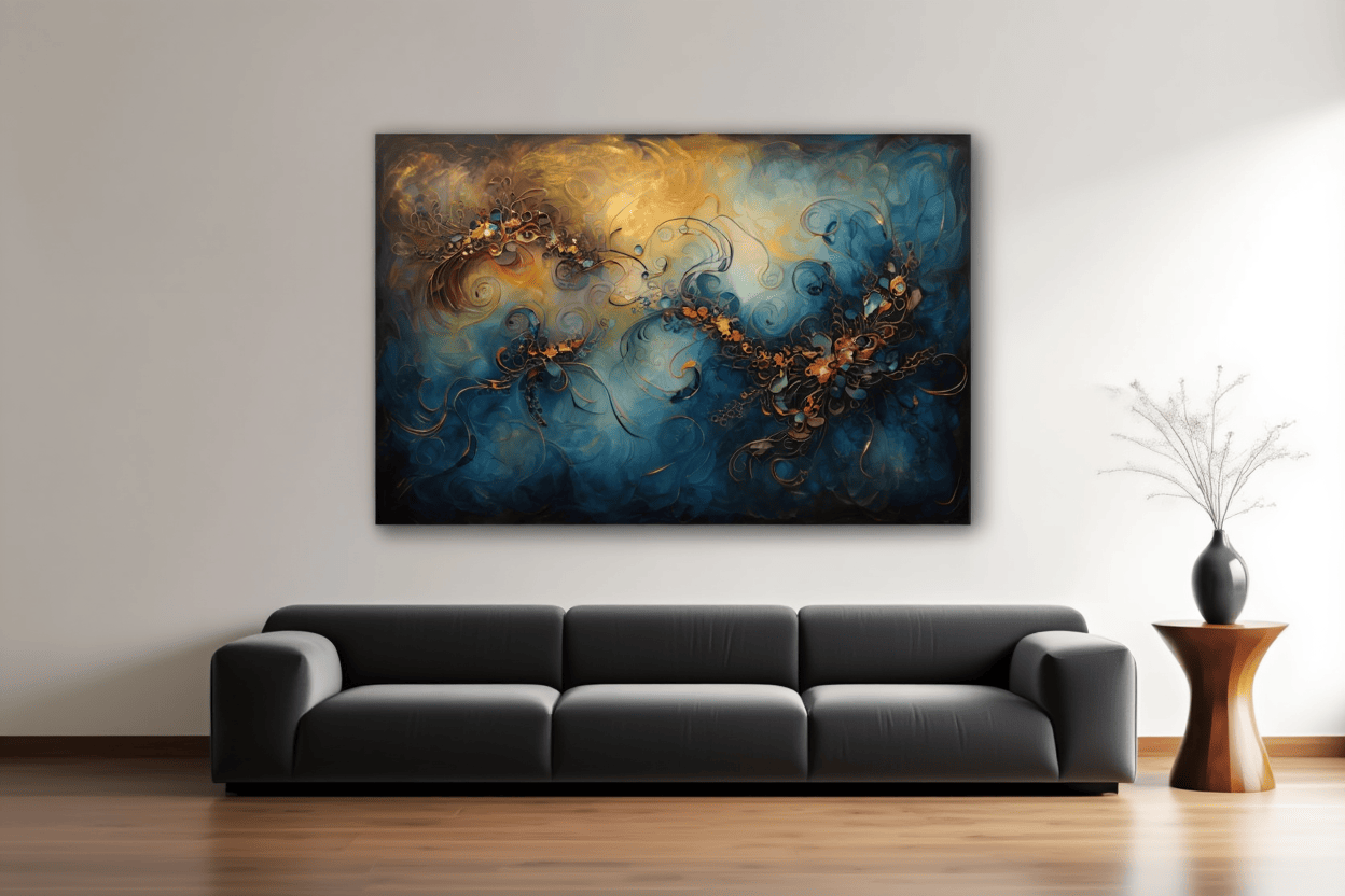 Immerse your space in harmony and visual poetry with this ethereal abstract painting inspired by the fluid beauty of music. Featuring elegant gold leaf accents, swirling shapes reminiscent of musical notes, and an enchanting palette of deep blues, copper, and warm browns, this piece evokes a dreamy, otherworldly atmosphere. Textured layers and luminous metallic highlights create a sense of movement and rhythm, while abstract forms dance across the canvas like a soft symphony. A perfect statement artwork for music lovers, modern interiors, and anyone seeking a refined, contemporary accent infused with emotion and artistic depth.