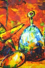 Part of an ongoing series of colorful decorative still lives. The picture has good spatial quality, and bright colors are pleasing. Expressionism. Modern. Acrylic painting on canvas, sides painted in the color of the painting, varnished, signed by the artist, ready to hang, certificate of authenticity.