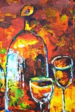 Evening still life 2. Expressive, bright still life: teapot, bottles of wine, glasses, pear on an abstract background.