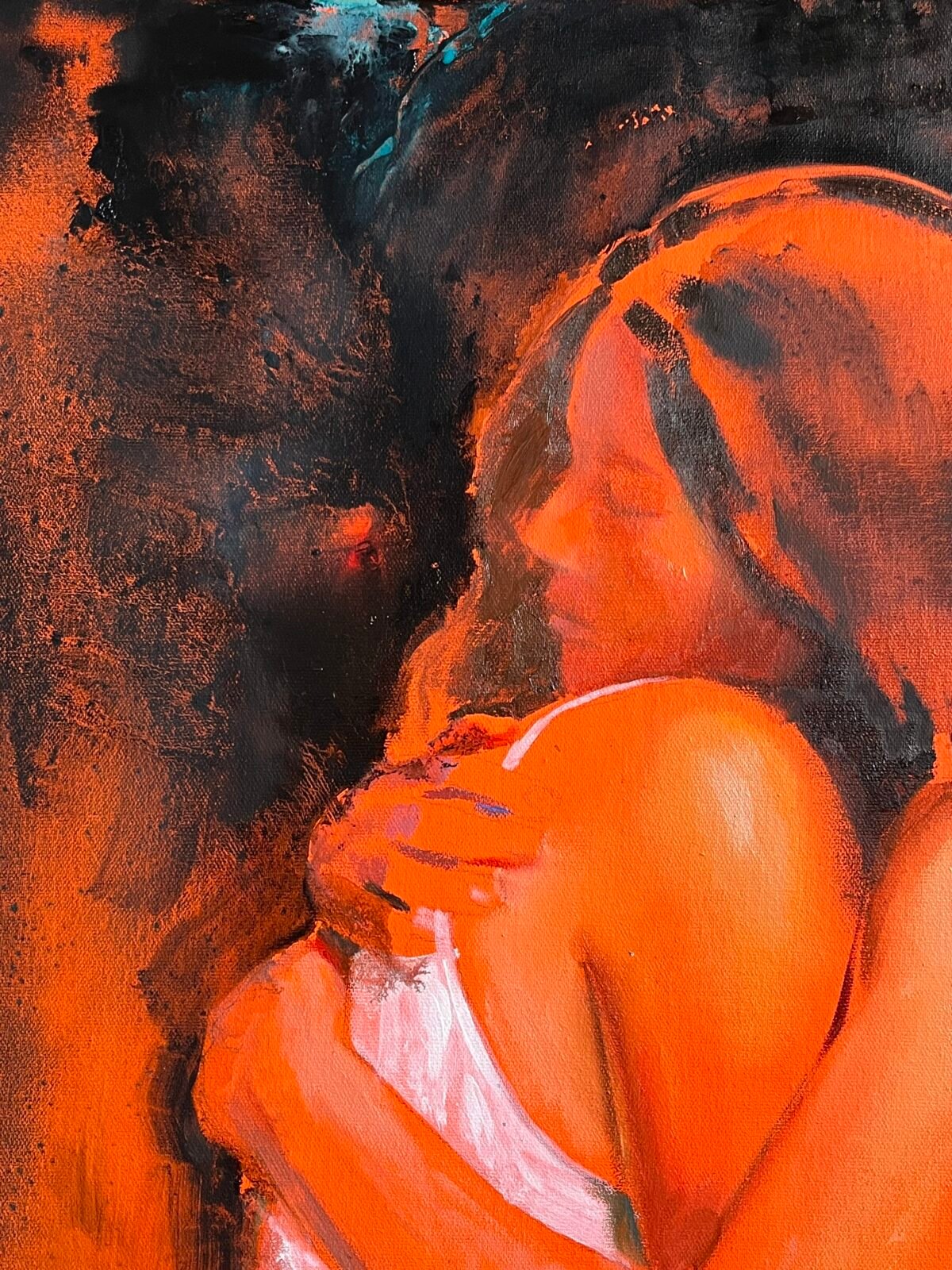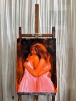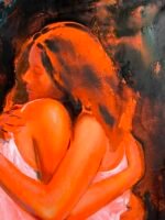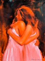 The painting depicts two young women in white dresses, gently embracing each other. Their closeness and support speak volumes without the need for words. Whether they are friends or sisters, their bond is undeniable—an intimate moment filled with mutual understanding and reassurance.